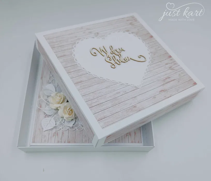 Kartka zapakowana w ozdobione tymi samymi papierami co kartka i tekturowym napisem pudełko